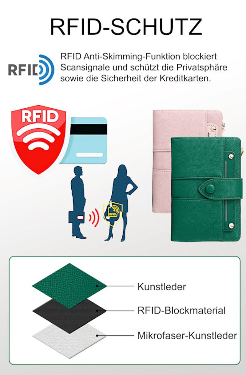 Die RFID-Anti-Skimming-Funktion blockiert Scansignale und schützt die Privatsphäre und Sicherheit der Kreditkarten.